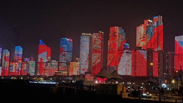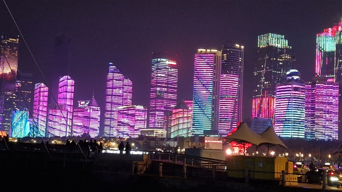 청도의 랜드마크 오월의 바람 조각상이 있는 밤야경 그야말로 홍콩의 야경을 보는듯한 풍경 눈이 휘둥거려진다. 건물을 감싸고 있는 불빛이 휘황찬란하다