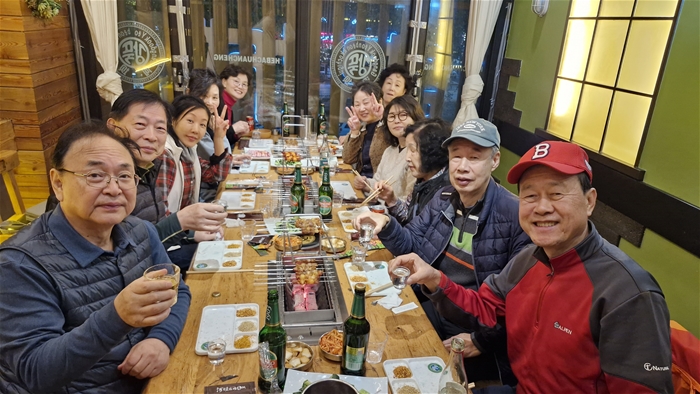 마사지를 받고 저녁 식사로 삽겹살 무제한 여기에 최인철가이드님이 청도맥주와 고량주를 주어 안주와 곁들여 저녁식사를 풍부하게 먹고나니 힘든 일정이 싹가신다.