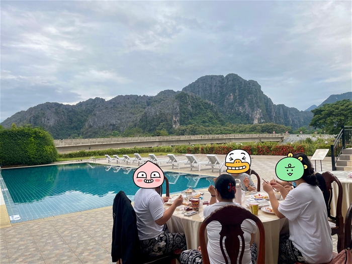 호텔 야외에서 조식을 먹는 사진 정말 풍경반 음식반 앞은 수영장 정말 최고 였음